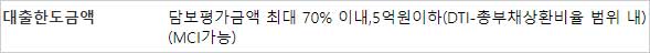 ▶ 담보평가금액 최대 70% 이내,5억원이하(DTI-총부채상환비율 범위 내) (MCI가능)