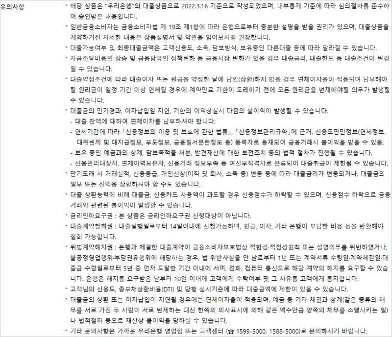 ▶ 해당 상품은 "우리은행"의 대출상품으로 2022.3.16 기준으로 작성되었으며, 내부통제 기준에 따라 심의절차를 준수하여 승인받은 내용입니다.