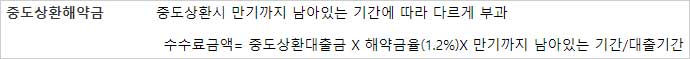 ▶ 수수료금액= 중도상환대출금 X 해약금율(1.2%)X 만기까지 남아있는 기간/대출기간