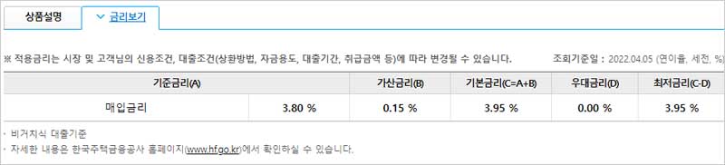 ▶ 기준금리(매입금리) : 한국주택금융공사에서 매월 고시