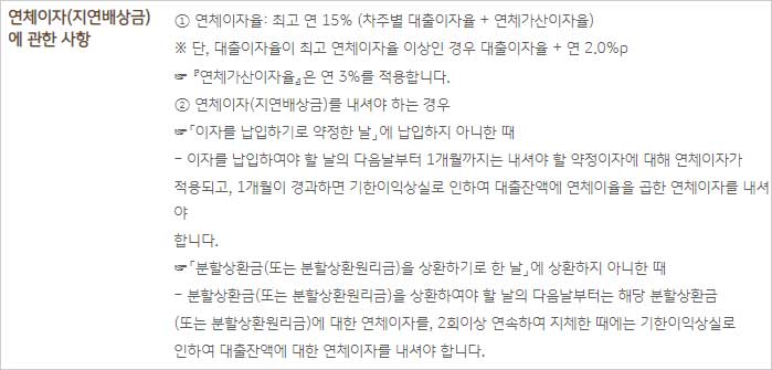 ① 연체이자율: 최고 연 15% (차주별 대출이자율 + 연체가산이자율)