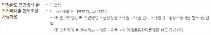 - KB 스타뱅킹 ▶ 전체메뉴 > 대출 > 관리 > 내맘대로통장자동대출 한도 증/감액)