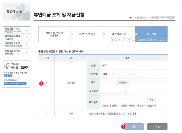 휴면예금 찾기 서비스 지급신청에 대한 절차가 진행되는데요. 이 단계는 출연 휴면예금을 이전할 대상을 선택할 수 있는 단계라고 해요. 본인계좌로 지급 받을 수 있으며 기부 선택도 가능하다고 해요.