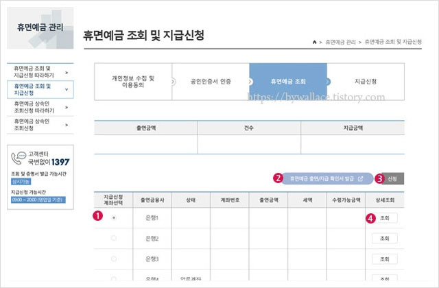 서민금융진흥원 휴면예금 찾기 서비스 사이트 등 온라인 이용이 어려운 경우 1397서민금융콜센터를 통해 휴면예금 조회 및 지급을 신청할 수 있구요. 또한 상속인, 대리인 등은 가까운 휴면예금 출연 금융회사(은행, 보험사) 영업점 또는 서민금융통합지원센터를 방문하면 휴면예금 조회 및 지급 신청이 가능하다고 해요.