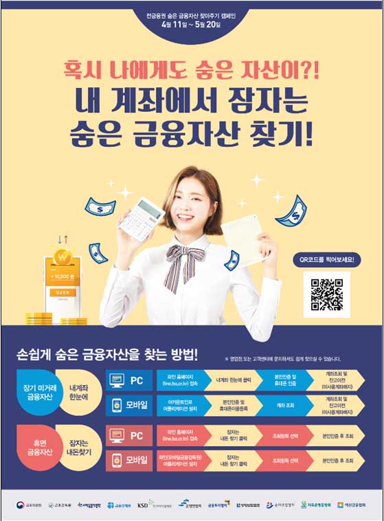 4월 11일부터 5월 20일까지 전 금융권 잠자는 돈 사이트 서비스 금융자산 찾기 캠페인이 실시된다고 합니다. 금융당국, 금융결제원, 서민금융진흥원, 한국예탁결제원, 금융협회가 공동 주관하고 은행, 보험, 증권사, 저축은행 등이 잠자는 돈 사이트 찾기 캠페인에 참가해 고객의 숨은 금융자산을 안내할 계획이라고 합니다.