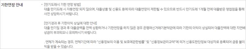 ▶ 대출 만기일 경과 후 대출금액을 전액 상환하거나 기한연장을 하지 않은 경우 은행여신거래기본약관에 따라 기한의 이익이 상실되어 대출잔액에 대한 지연배상금이 부과되오니 유의하시기 바랍니다.