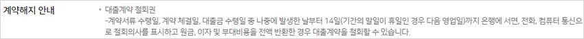 -계약서류 수령일, 계약 체결일, 대출금 수령일 중 나중에 발생한 날부터 14일(기간의 말일이 휴일인 경우 다음 영업일)까지 은행에 서면, 전화, 컴퓨터 통신으로 철회의사를 표시하고 원금, 이자 및 부대비용을 전액 반환한 경우 대출계약을 철회할 수 있습니다.