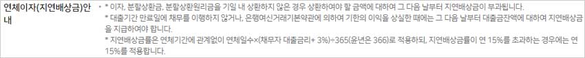 * 이자, 분할상환금, 분할상환원리금을 기일 내 상환하지 않은 경우 상환하여야 할 금액에 대하여 그 다음 날부터 지연배상금이 부과됩니다.