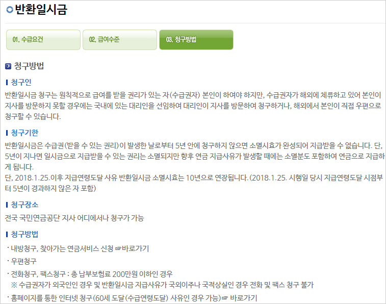 - 전화청구, 팩스청구 : 총 납부보험료 200만원 이하인 경우에 가능합니다. 단 수급권자가 외국인인 경우 및 반환일시금 지급사유가 국외이주나 국적상실인 경우 전화 및 팩스 청구 불가합니다.