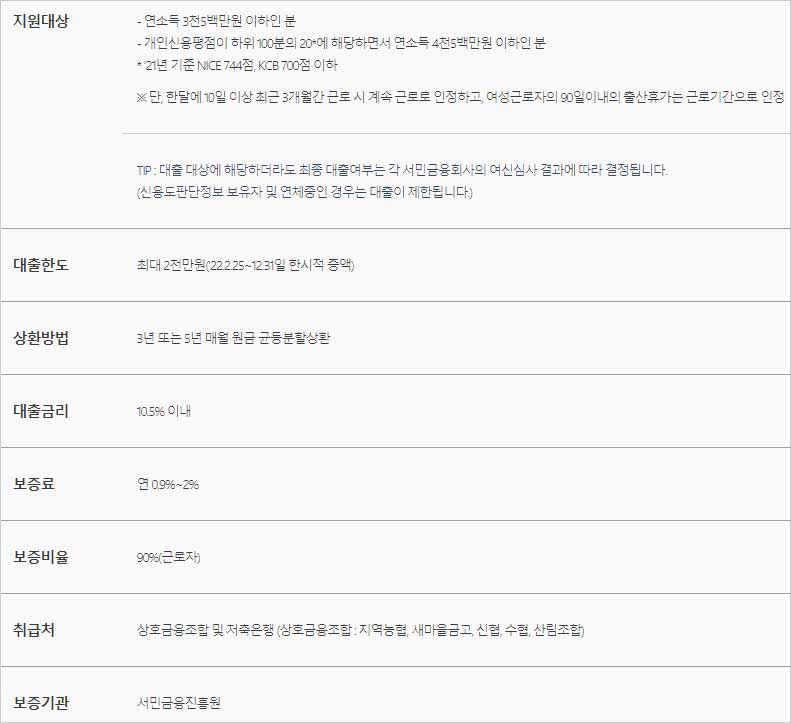 TIP : 대출 대상에 해당하더라도 최종 대출여부는 각 서민금융회사의 여신심사 결과에 따라 결정됩니다.(신용도판단정보 보유자 및 연체중인 경우는 대출이 제한됩니다.)