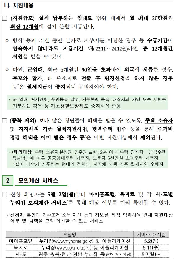 신청 희망자는 오는 5월 2일(월)부터 마이홈포털, 복지로 및 각 시, 도별 누리집 모의계산 서비스를 통해 대상 여부를 미리 확인할 수 있다고 합니다. 신청기간은 2022년 8월부터 2023년 8월까지로, 1년동안 수시 신청이 가능하다고 합니다.