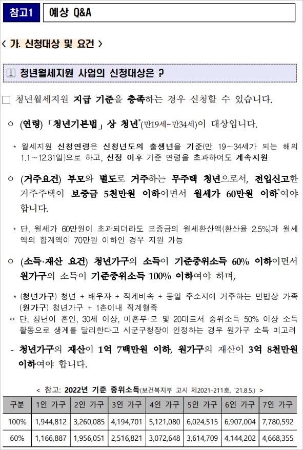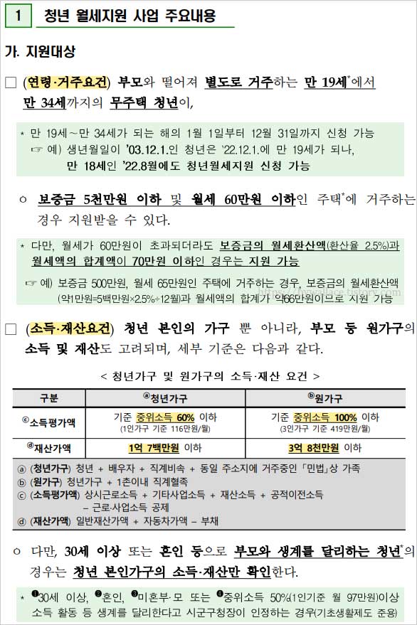 ▣ 청년 월세 20만원 한시 특별지원사업 지원 자격대상 - 소득 및 재산요건