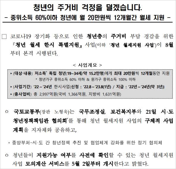 21일 국토교통부는 국무조정실, 보건복지부와 시 도 청년정책책임관 협의회를 통해 청년 월세지원 사업의 구체적 사업계획을 지자체와 공유하고, 청년들이 지원가능 여부를 사전에 확인할 수 있는 청년 월세지원 사업 모의계산 서비스를 5월 2일부터 개시한다고 밝혔다고 합니다.