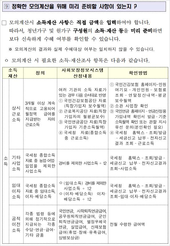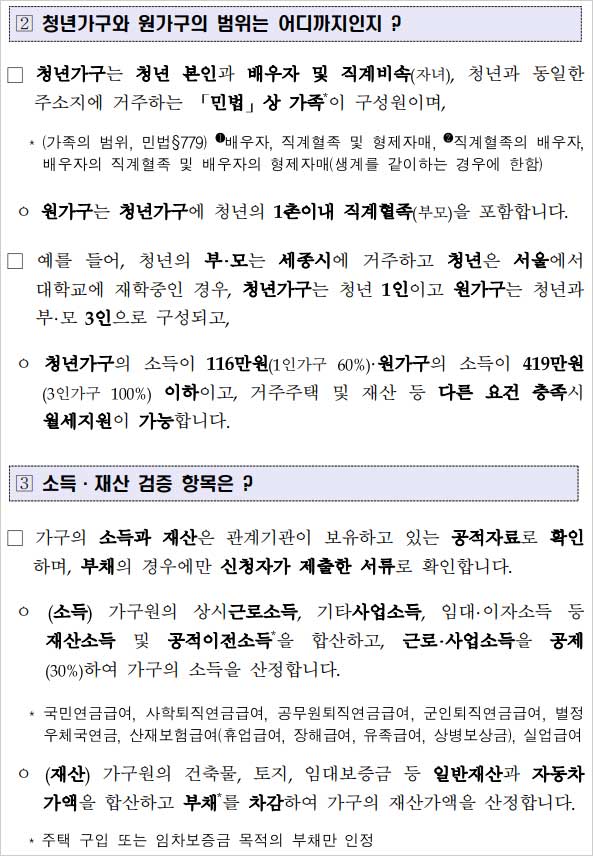 다만 30세 이상 또는 혼인한 청년, 20대가 월 97만원(1인가구 기준중위소득 50%) 이상의 소득이 있다면 청년 본인가구의 소득과 재산만 확인한다고 합니다.
