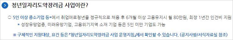2022년 청년 일자리 도약 장려금 사업이란 5인 이상 중소기업 등에서 취업애로청년을 정규직으로 채용 후 6개월 이상 고용유지시 월 80만원, 최장 1년간 인건비를 지원하는 사업이라고 합니다.