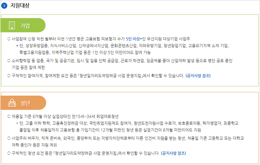 2022년 청년 일자리 도약 장려금 신청 사업 지원대상 자격 조건 중 기업 및 청년 지원대상 자격 조건이라고 합니다.