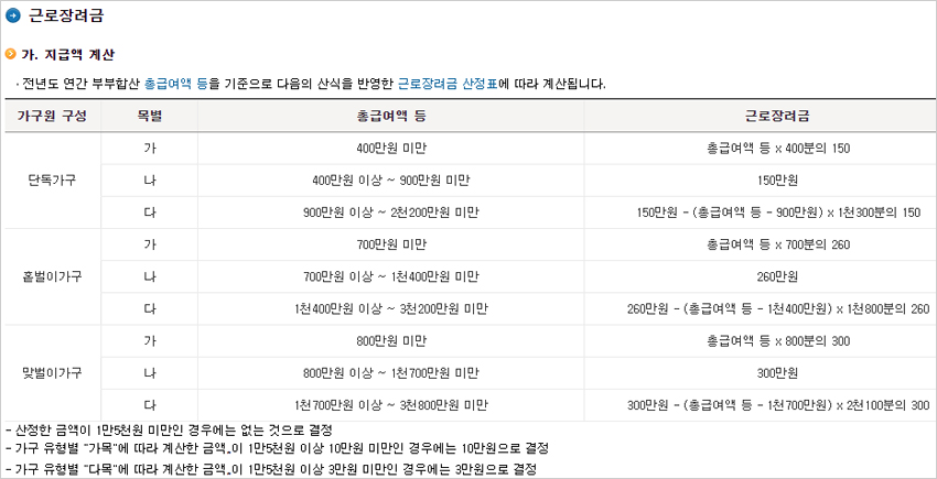 특히 올해부터는 근로장려금을 신청할 수 있는 가구별 총 소득기준금액이 200만원씩 상향됨에 따라 더 많은 가구가 장려금을 수령할 수 있게 된다고 합니다.