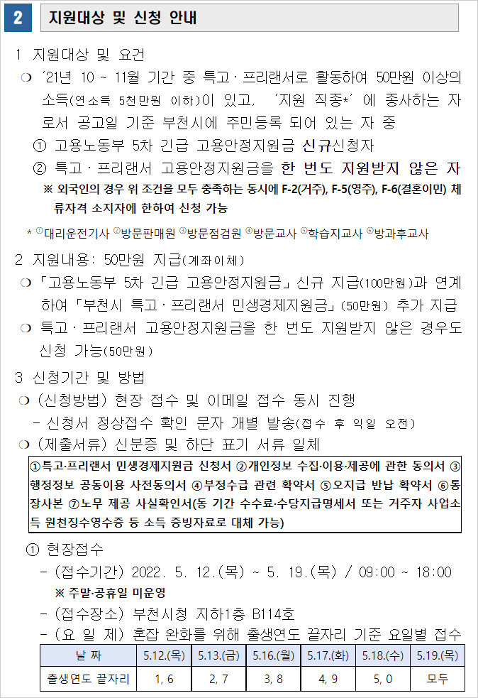 부천시 특고 프리랜서 민생경제지원금 지원대상 및 자격요건, 지원내용, 부천시 특고 프리랜서 민생경제지원금 신청방법과 부천시 특고 프리랜서 민생경제지원금 제출서류 등과 관련된 안내입니다.