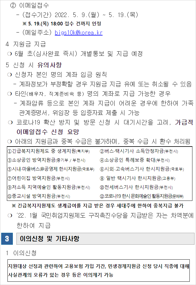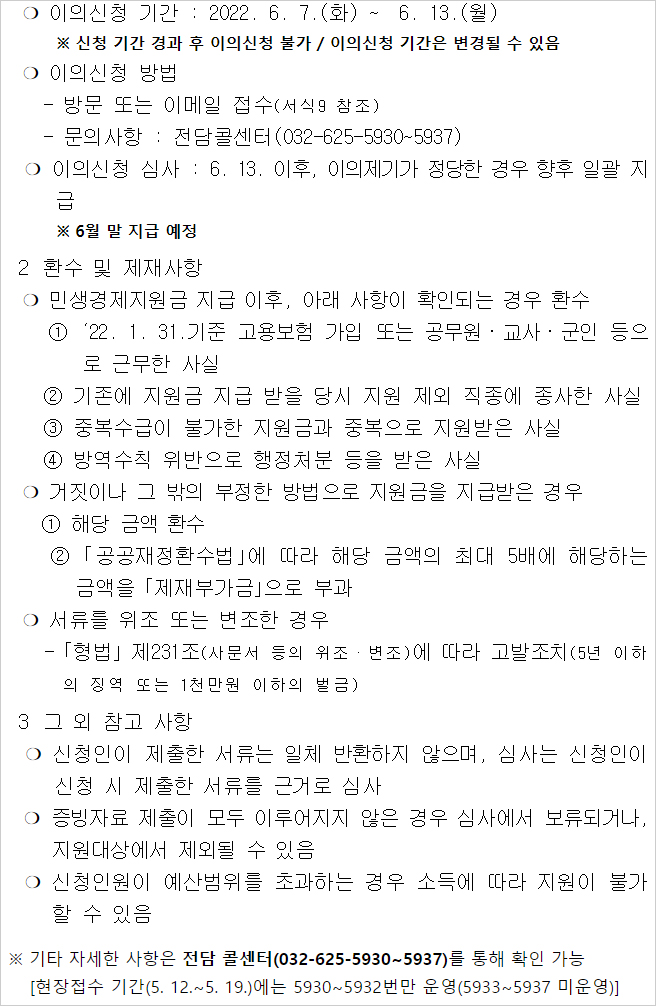 부천시 특고 프리랜서 민생경제지원금 지급 및 신청시 유의사항, 이의신청 방법 등에 관한 공고문 내용입니다.