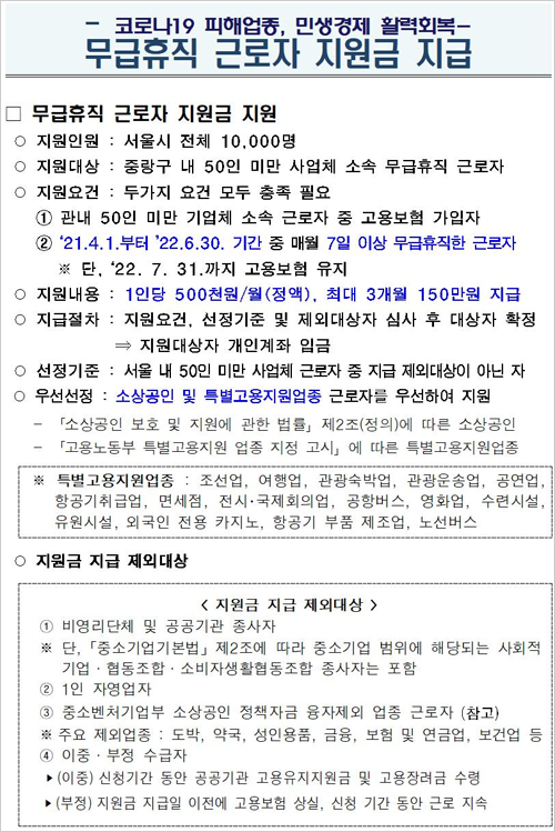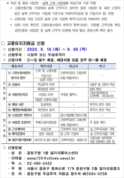 무급휴직 근로자 지원금 및 재창업 소상공인 고용지원금 신청방법과 관련해 신청을 원하는 대상자는 중랑구청 1층 일자리플러스센터에 방문하거나 이메일(anna725@citizen.seoul.kr) 혹은 팩스(02-490-4432), 우편(봉화산로 179 중랑구청 2층 일자리창출과) 등의 방법으로 신청하면 된다고 합니다.