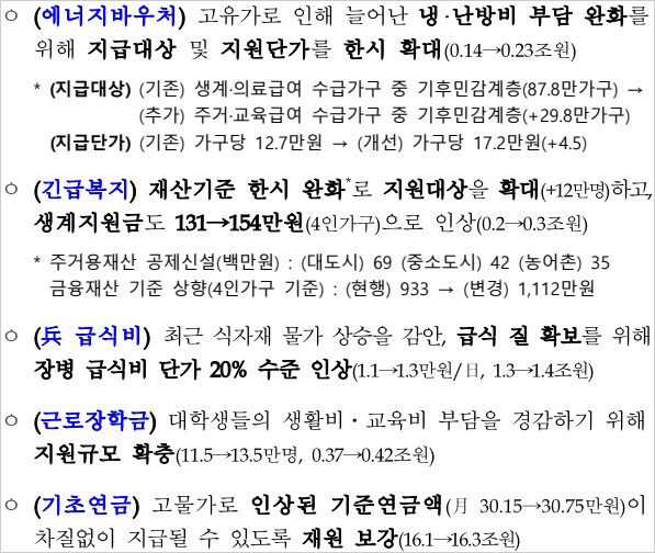 정부는 또 고유가에 따른 냉, 난방비 부담 완화를 위해 에너지바우처 지급 대상을 확대하고 지원 단가도 1400억 원에서 2300억 원으로 늘린다고 합니다. 최근 식자재 물가 상승을 감안해 급식의 질을 확보하고자 군 장병의 급식비 단가를 하루 기준 1만1000원에서 1만 3000원으로 인상한다고 합니다.