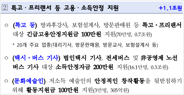 법인택시 기사와 전세버스 및 비공영제 노선버스 기사 16만1000명에게도 소득안정자금 명목으로 200만원씩 일괄 지급된다고 합니다. 문화예술인 3만명에 대한 활동지원금은 이번 추경에서도 1차 추경과 마찬가지로 일괄 100만원으로 책정됐다고 합니다.