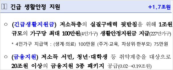 오늘은 추경안에 담긴 저소득층 긴급생활안정자금지원 대상 최대 100만원 지급 소식 등에 대해 간단하게 알아볼게요. 정부가 추경안을 통해 저소득 취약계층을 대상으로 4인 가구당 최대 100만원의 긴급 생활안정 지원금을 지급한다고 합니다.