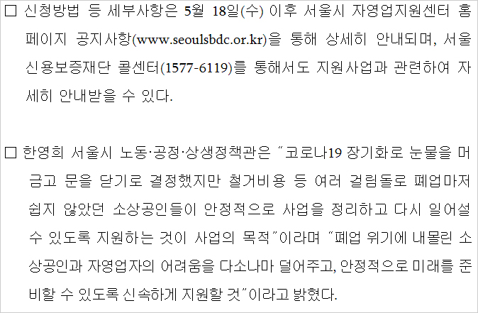 소상공인 재기지원금인 서울시 폐업지원금 신청 방법 등 세부사항은 지난 5월 18일(수) 이후 서울시 자영업지원센터 홈페이지 공지사항(www.seoulsbdc.or.kr)을 통해 상세히 안내되고 있구요. 또한 서울신용보증재단 콜센터(1577-6119)를 통해서도 지원사업과 관련하여 자세히 안내받을 수 있다고 합니다.