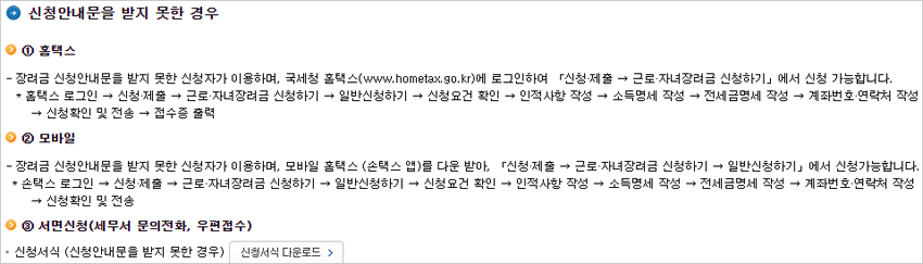 국세청은 신청대상자의 이해를 돕기 위해 올해부터 신청요건 및 미안내자 신청방법과 관련한 동영상을 제공하고 있다고 합니다. 이를 위해 모바일안내문에 'URL 주소'를, 우편안내문에는 '큐알(QR)코드'를 추가했다고 합니다. 신청완료 후에는 '홈택스(앱)' 심사진행현황에서 신청내역확인, 심사단계, 심사결과 등 장려금 진행상황을 조회할 수 있다고 합니다.