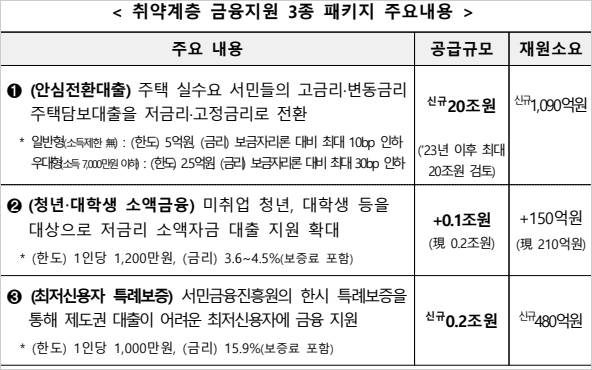 또한 저소득 서민과 청년 및 대학생 등 취약계층을 대상으로도 20조 원 이상의 '금융지원 3종 패키지'를 공급하기로 했다고 합니다. 우선 안심전환대출을 통해 주택 실수요 서민들의 '고금리 및 변동금리 주택담보대출을 '저금리 및 고정금리'로 전환해줄 방침이라고 합니다.