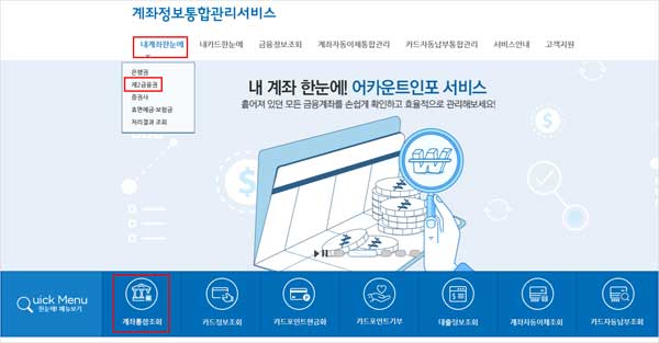 또한 내 예금 찾아줌 홈페이지 서비스 내계좌 한눈에를 통하면 모든 금융기관의 계좌를 조회 및 변경 할 수 있을 뿐만 아니라 금융관련 통합관리 서비스도 제공 받을 수 있다고 합니다.