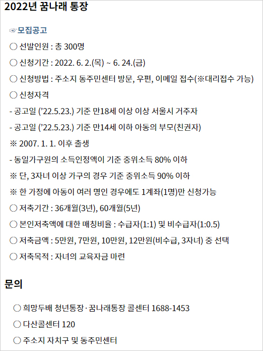 이상은 2022 서울시 꿈나래통장 신청 자격 대상 및 서울시 꿈나래통장 신청방법, 서울시 꿈나래통장 신청기간, 지급금액과 더불어 서울시 희망두배 청년통장 신청방법, 서울시 희망두배 청년통장 자격 대상, 신청기간 등에 대한 간단 정보였습니다. 참고하셨으면 좋겠습니다.
