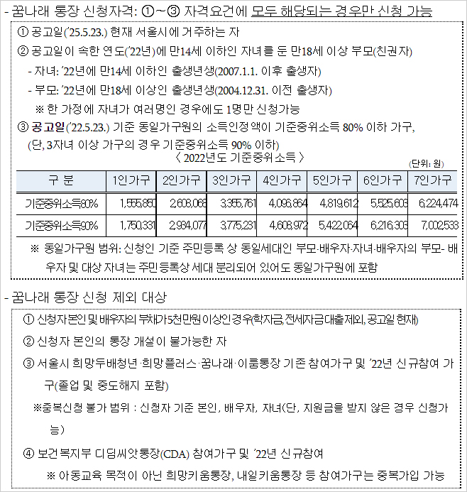 서울시 희망두배 청년통장 신청과 더불어 서울시 꿈나래통장 가입자 300명도 모집한다고 합니다. 만 14세 이하 자녀를 양육하는 저소득가구의 자산형성을 지원하는 서울시 꿈나래통장 신규 참여자도 희망두배 청년통장과 같은 기간 동안 300명 모집한다고 합니다.