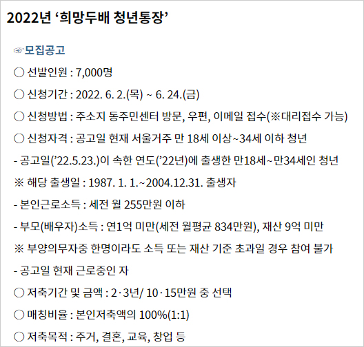서울시가 청년들이 안정적으로 미래계획을 세워 자립할 수 있도록 2022년 희망두배 청년통장 신규 참여자 7,000명을 모집한다고 합니다.