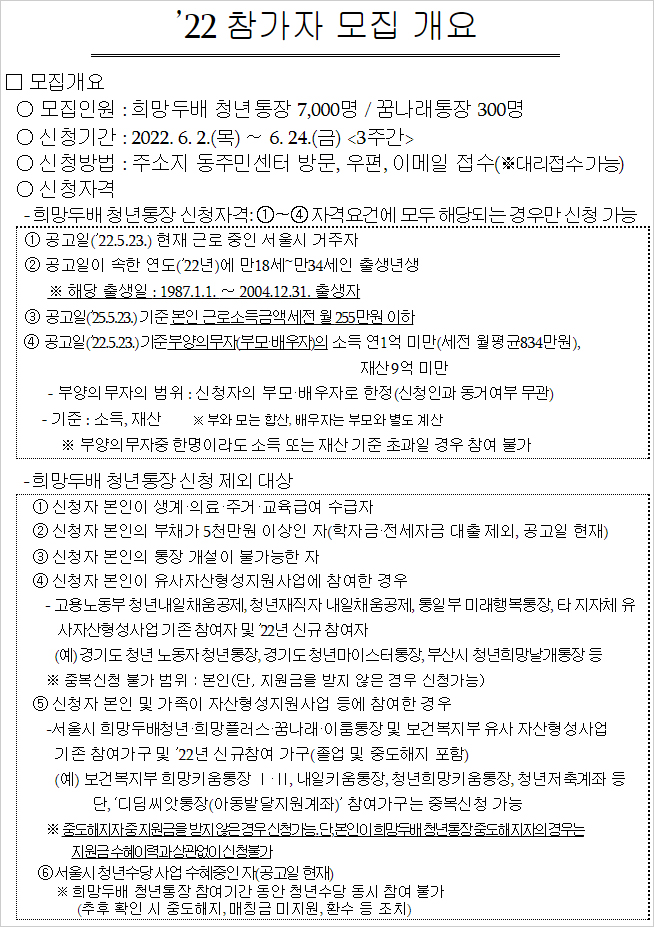 희망두배 서울시 청년통장 자격에 대해 알아보겠습니다. 서울시가 청년들이 안정적으로 미래계획을 세워 자립할 수 있도록 2022년 희망두배 청년통장 신규 참여자 7,000명을 모집한다고 합니다.