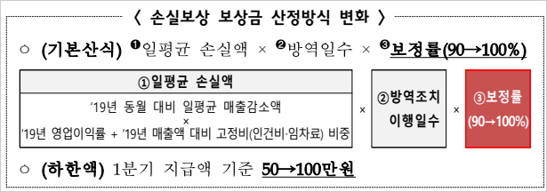 매출 감소율은 2019년 대비 2020년, 2019년 대비 2021년, 2020년 대비 2021년 등의 시기 중 매출 감소율이 가장 큰 시기를 기준으로 산정하게 된다고 합니다. 연매출 규모도 2019∼2021년 중 매출이 가장 많은 연도를 기준으로 잡는다고 합니다.