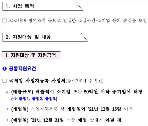 또한 2022년 2차 추가경정예산에 포함된 사업 중 긴급고용안정지원금 등의 사업을 지원받은 경우 및 비영리기업 단체 법인 및 법인격 없는 조합이 지원제외대상이라고 합니다. 특히 집합금지 영업제한 조치 위반시 지원 제외가 가능하다고 합니다.