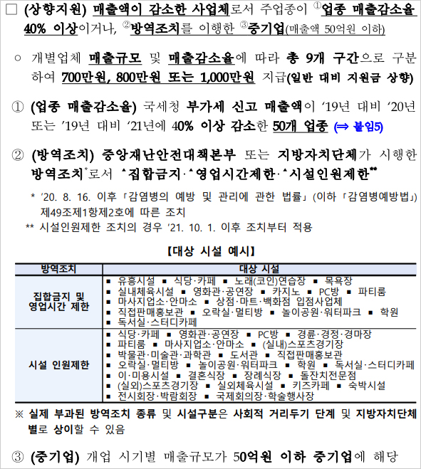 또한 2022년 2차 추가경정예산에 포함된 사업 중 긴급고용안정지원금 등의 사업을 지원받은 경우 및 비영리기업 단체 법인 및 법인격 없는 조합이 지원제외대상이라고 합니다. 특히 집합금지 영업제한 조치 위반시 지원 제외가 가능하다고 합니다.