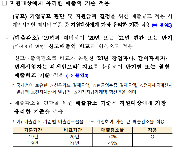 소상공인 손실보전금 자격 대상 확인 매출감소 여부는 2019년 대비 2020년 또는 2020년 대비 2021년 연간 혹은 반기별 부가세 신고매출액을 기준으로 판단한다고 합니다. 지난해 개업자나 간이과세자, 면세사업자 등 부가세 신고매출액으로 연간 또는 반기 매출감소 판단을 할 수 없는 경우에는 신용카드 결제액, 현금영수증 발행액, 전자세금계산서 발급액 등 과세인프라 자료를 활용해 반기 또는 월평균 매출을 비교한다고 합니다.