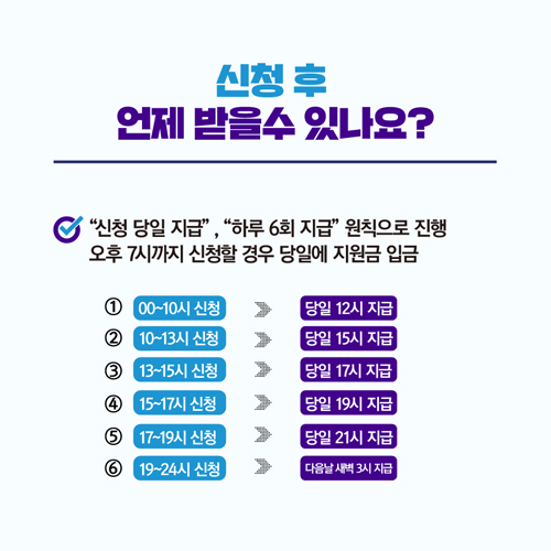 소상공인 손실보전금 대상 확인 지급에 대해 알아보면 '신청 당일 지급'과 '하루 6회 지급'을 원칙으로 한다고 합니다. 오후 7시까지 신청하면 당일에 지원금이 입금된다고 합니다. 구체적으로 보면 자정∼오전 10시 신청 시 낮 12시 지급, 오전 10시∼오후 1시 신청시 오후 3시 지급, 오후 1∼3시 신청시 오후 5시 지급, 오후 3∼5시 신청시 오후 7시 지급, 오후 5∼7시 신청시 오후 9시 지급, 오후 7∼자정 신청시 다음날 오전 3시 지급이 이뤄진다고 합니다.
