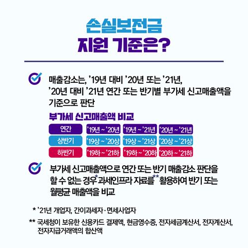 소상공인 손실보전금 지원기준은 매출 규모와 감소율을 고려해 업체당 최소 600만원에서 최대 1000만원까지 지급된다고 합니다. 매출감소 여부는 2019년 대비 2020년 또는 2021년, 2020년 대비 2021년 연간 또는 반기별 부가세 신고매출액을 기준으로 판단한다고 합니다. 부가세 신고매출액으로 연간 또는 반기 매출감소 여부나 규모를 판단할 수 없는 경우에는 과세인프라 자료를 활용해 반기 또는 월평균 매출을 비교한다고 합니다.