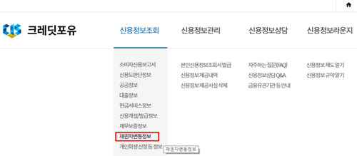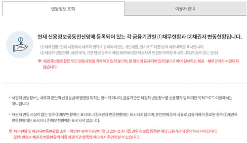 크레딧포유 신용정보조회에서 채권자변동정보를 클릭하면..