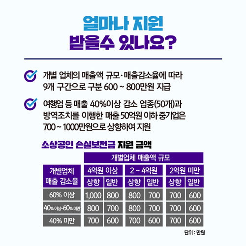 소상공인 손실보전금 지급 기준은 매출 규모와 감소율을 고려해 업체당 최소 600만원에서 최대 1000만원까지 지급된다고 합니다. 매출감소 여부는 2019년 대비 2020년 또는 2021년, 2020년 대비 2021년 연간 또는 반기별 부가세 신고매출액을 기준으로 판단한다고 합니다. 부가세 신고매출액으로 연간 또는 반기 매출감소 여부나 규모를 판단할 수 없는 경우에는 과세인프라 자료를 활용해 반기 또는 월평균 매출을 비교한다고 합니다.