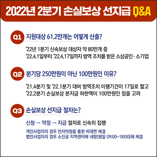 2022년 2분기 소상공인 손실보상선지급 대상확인 조회 및 신청방법, 지원내용 등 보다 자세한 내용은 손실보상선지급.kr이나 소상공인 정책자금 홈페이지(http://ols.sbiz.or.kr), 기업마당(http://www.bizinfo.go.kr) 등에서 확인하거나 손실보상 콜센터(1533-3300),소진공 70개 지역센터를 통해 문의하면 된다고 합니다. 참고하셨으면 좋겠습니다.