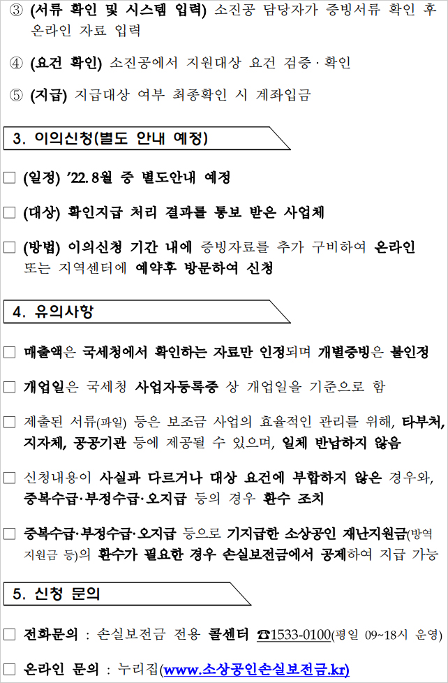 ②지원 요건을 갖췄지만 신속지급 방식으로 신청할 수 없었던 사람도 소상공인 손실보전금 확인지급 신청 대상에 포함된다고 합니다. 본인명의 휴대폰이나 공동인증서, 간편인증을 통한 본인확인이 불가능하거나 미성년자 또는 이름 및 주민등록번호가 변경된 경우가 이에 해당된다고 합니다. 입원, 사망, 해외체류 등으로 대리인이 받아야 하거나 타인 명의 계좌로 지원금을 받고자 하는 경우에도 위임장 등을 반드시 제출해야 한답니다.