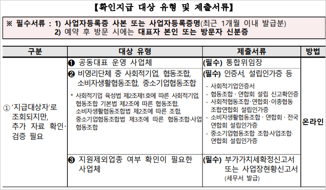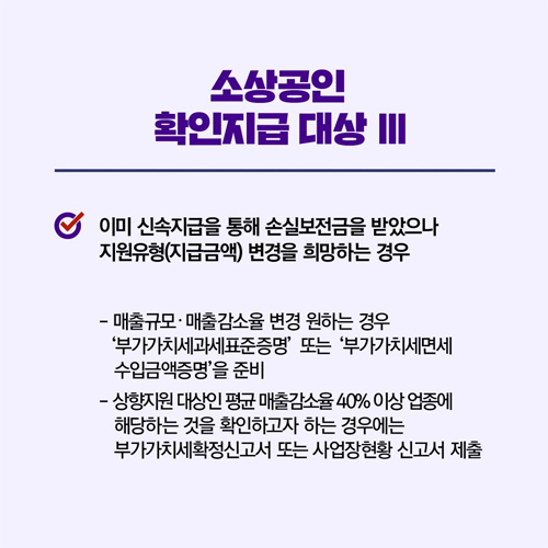 이미 ③신속지급을 통해 손실보전금을 받았지만, 지급 금액을 변경할 때도 확인지급을 신청해야 합니다. 이 경우 매출 규모·매출 감소율을 변경해야 해 부가가치세과세표준증명 또는 부가가치세면세수입금액증명을 준비해야 한답니다. 상향 지원 대상인 평균 매출 감소율 40% 이상 업종에 해당하는지 여부를 확인하고자 할 때는 부가가치세확정신고서 또는 사업장현황신고서를 제출하면 된다고 합니다.