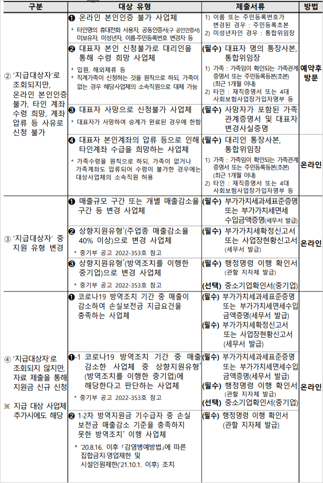 소상공인 손실보전금 확인지급 서류 중 ② 지급대상자로 조회되지만, 온라인 본인인증 불가, 타인 계좌 수령 희망, 계좌 압류 등 사유로 신청이 불가한 경우와 ③ 지급대상자 중 지원 유형 변경 사항이나 ④ 지급대상자로 조회되지 않지만, 자료 제출을 통해 지원금을 신규 신청(지급 대상 사업체 추가 포함)시 필요한 서류는 아래와 같다고 합니다.