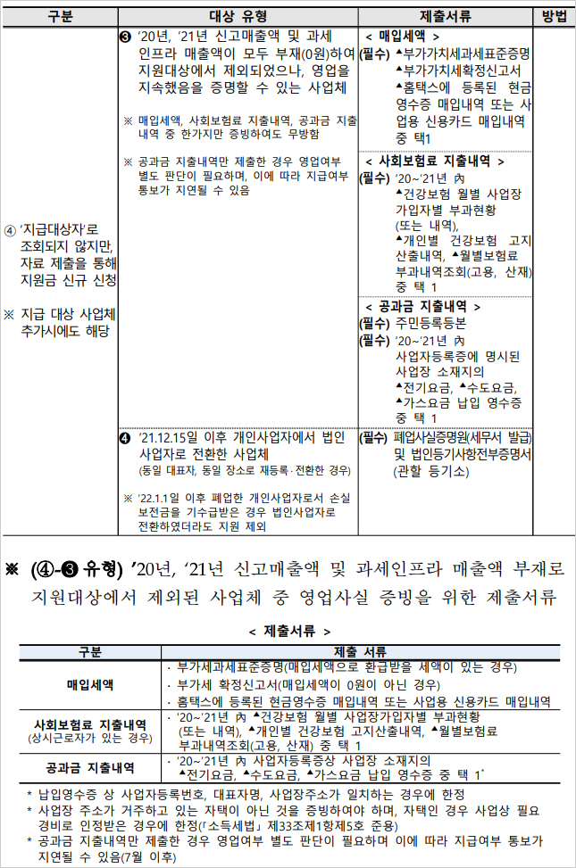 소상공인 손실보전금 확인지급 서류 중 특히 ④- ➌ 유형에서 2020년, 2021년 신고매출액 및 과세인프라 매출액 부재로 지원대상에서 제외된 사업체 중 영업사실 증빙을 위한 제출서류 등도 참고하셨으면 좋겠습니다.