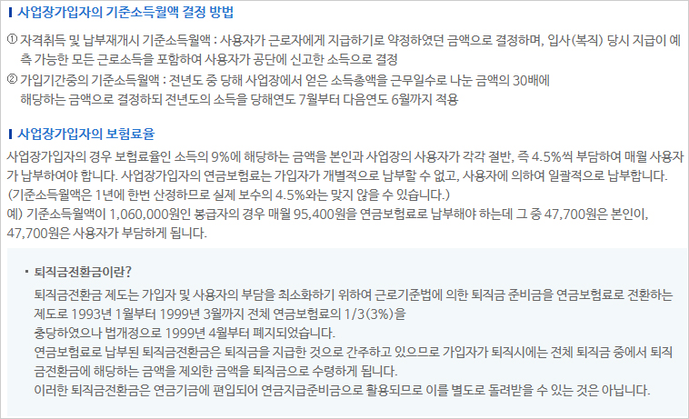 예) 기준소득월액이 1,060,000원인 봉급자의 경우 매월 95,400원을 연금보험료로 납부해야 하는데 그 중 47,700원은 본인이, 47,700원은 사용자가 부담하게 됩니다.