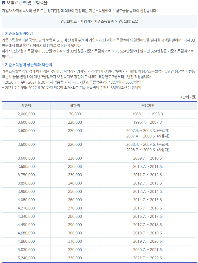 - 2020.7.1.부터 2021.6.30.까지 적용할 최저 및 최고 기준소득월액은 각각 32만원과 503만원이였으며 - 2021.7.1.부터 2022.6.30.까지 적용할 최저 및 최고 기준소득월액은 각각 33만원과 524만원입니다.